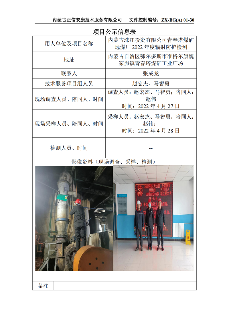 內蒙古珠江投資有限公司青春塔煤礦選煤廠2022年度輻射防護檢測