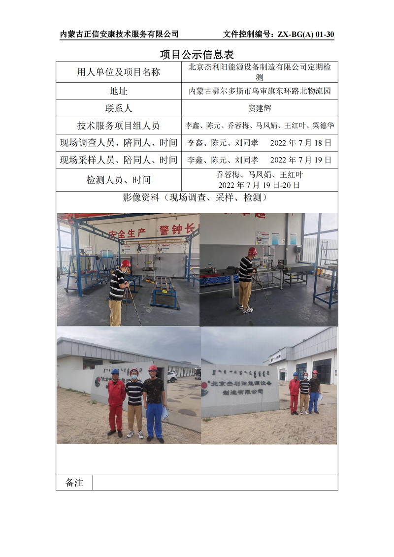 北京杰利陽能源設備制造有限公司定期檢測項目公示