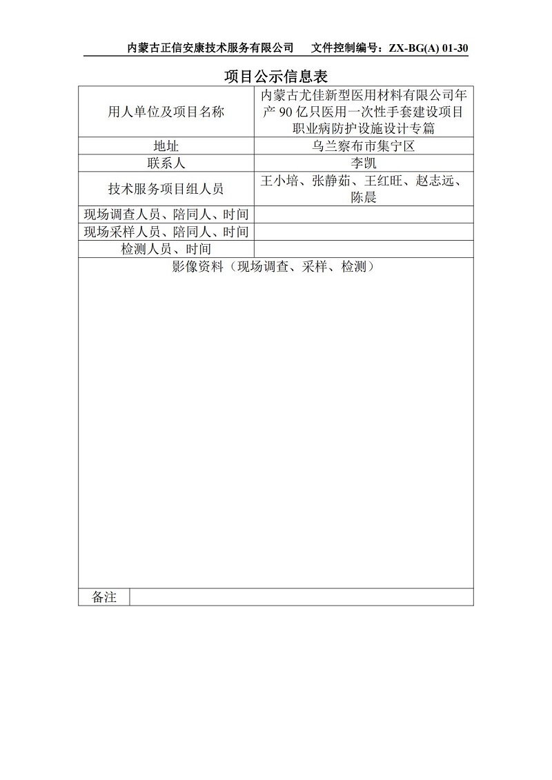 內蒙古尤佳新型醫用材料有限公司年產90億只醫用一次性手套建設項目職業病防護設施設計專篇公示信息表