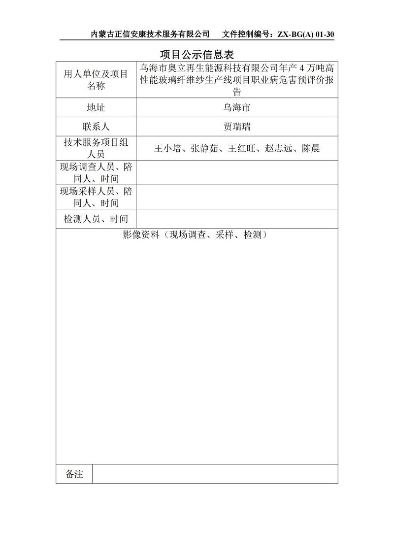 烏海市奧立再生能源科技有限公司年產4萬噸高性能玻璃纖維紗生產線項目職業病危害預評價報告公示信息表