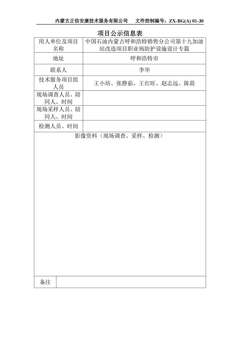 中國石油內蒙古呼和浩特銷售分公司第十九加油站改造項目職業病防護設施設計專篇公示信息表