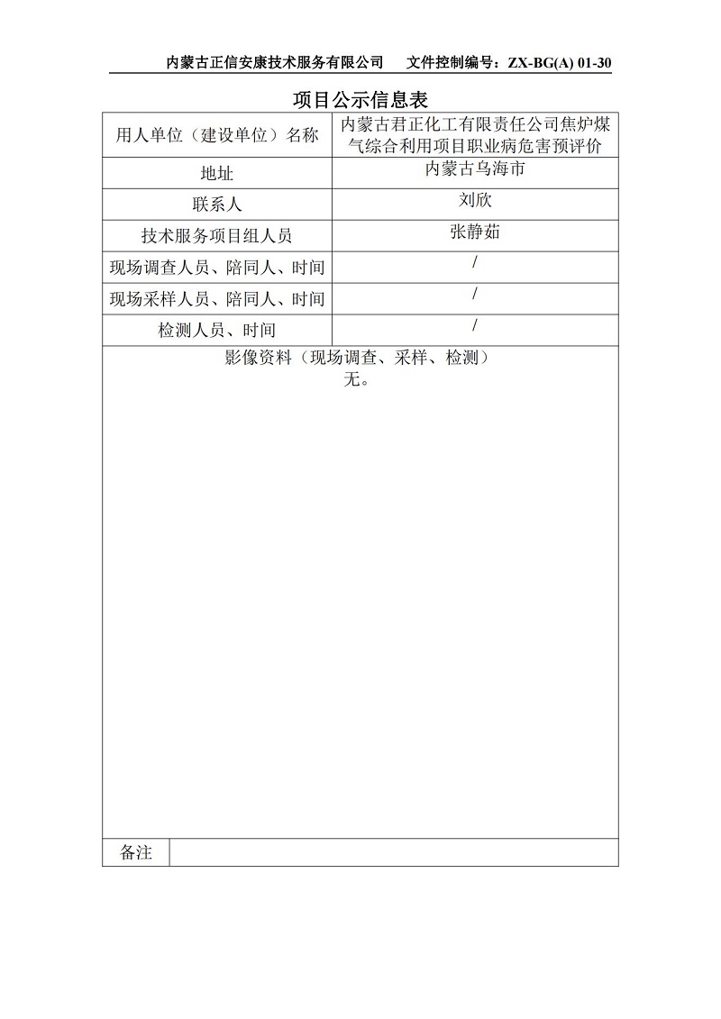 內蒙古君正化工有限責任公司焦爐煤氣綜合利用項目職業病危害預評價