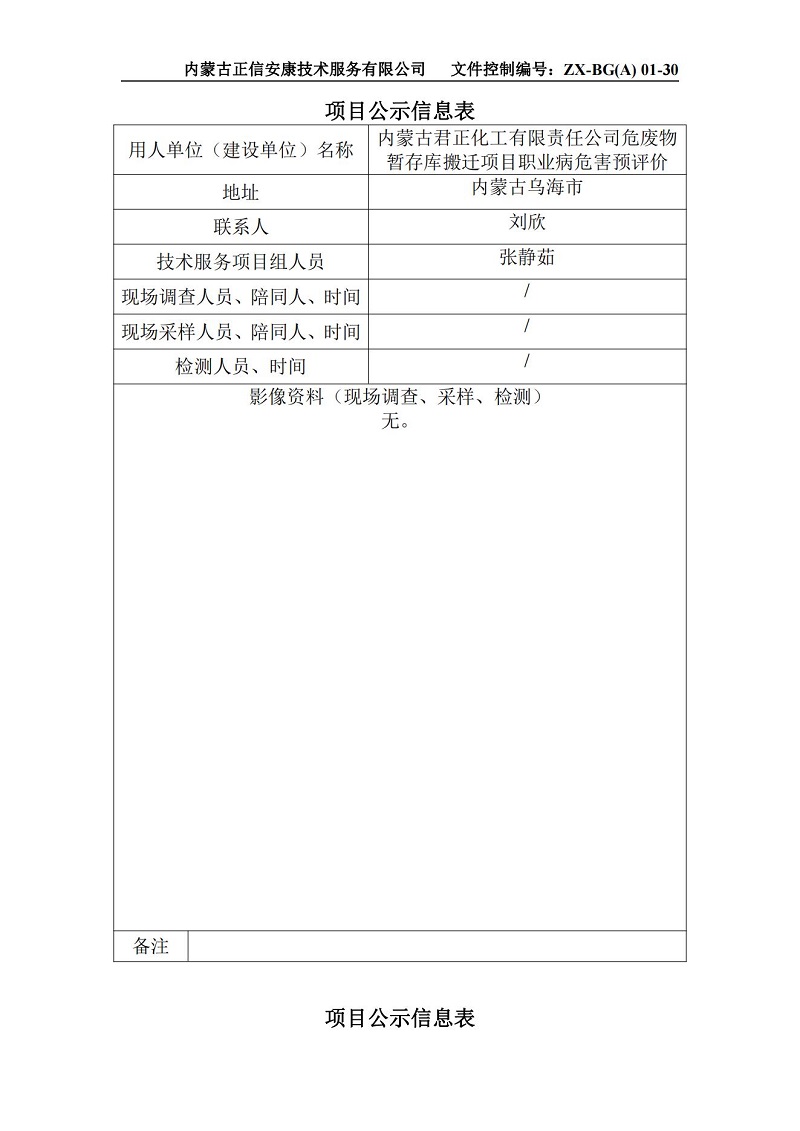 內蒙古君正化工有限責任公司危廢物暫存庫搬遷項目職業病危害預評價