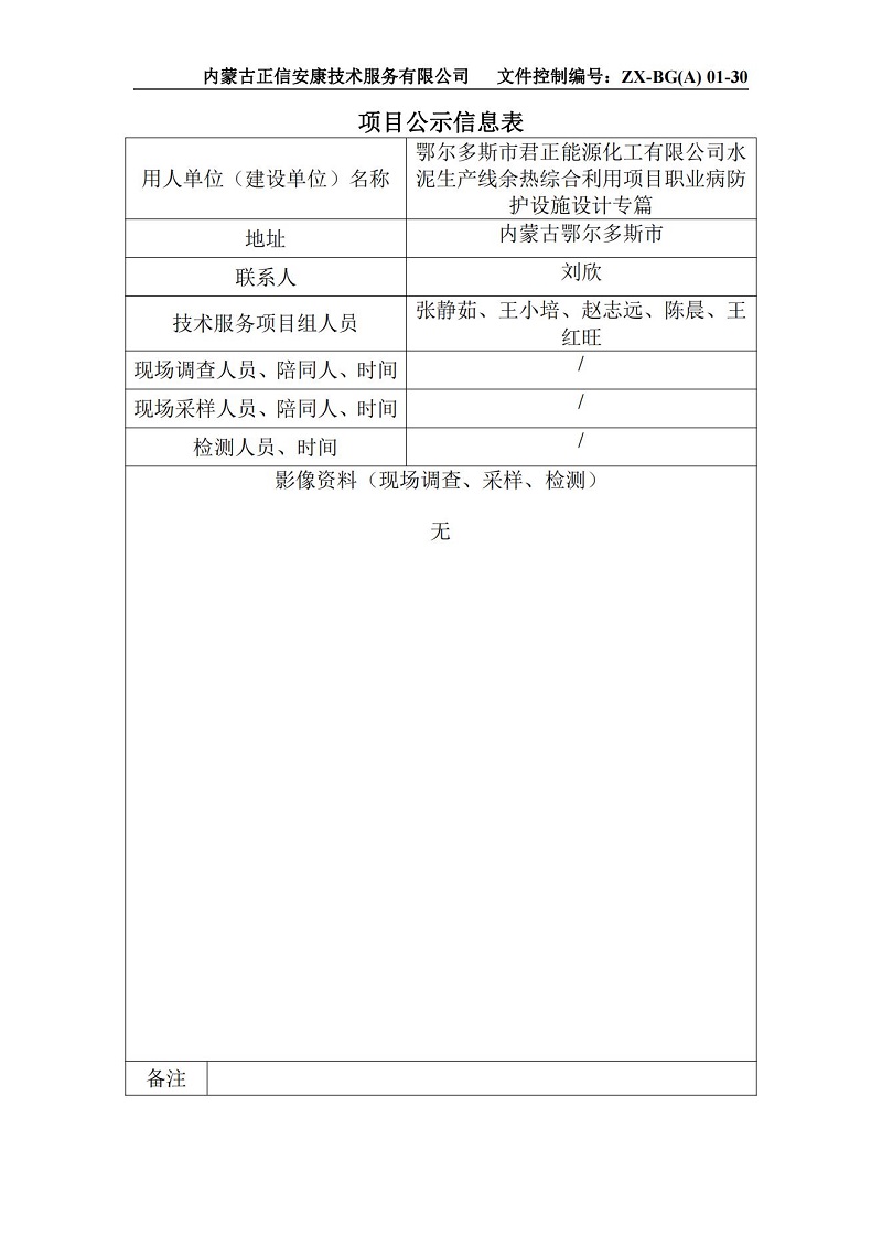 鄂爾多斯市君正能源化工有限公司水泥生產線余熱綜合利用項目職業病防護設施設計專篇項目公示