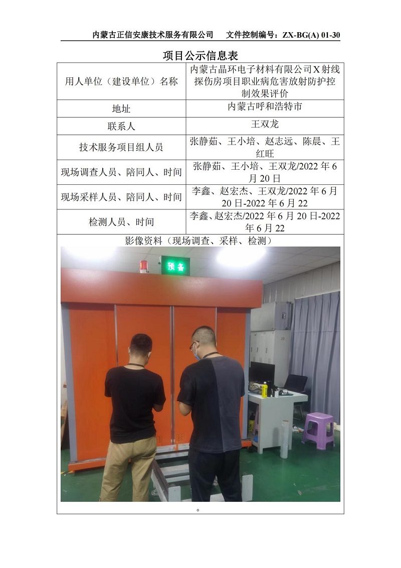 內蒙古晶環電子材料有限公司X射線探傷房項目職業病危害放射防護控制效果評價項目公示