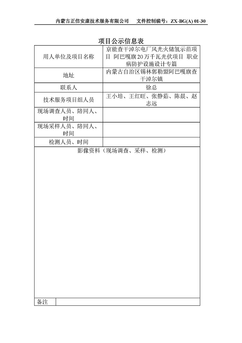 京能查干淖爾電廠風光火儲氫示范項目 阿巴嘎旗20萬千瓦光伏項目 職業病防護設施設計專篇公示信息表