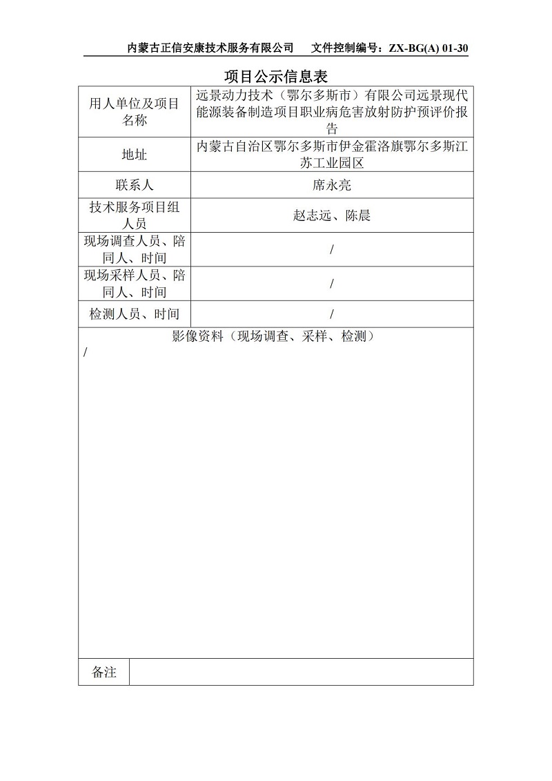 遠景動力技術(鄂爾多斯市)有限公司遠景現代能源裝備制造項目職業病危害放射防護預評價報告-項目公示信息表