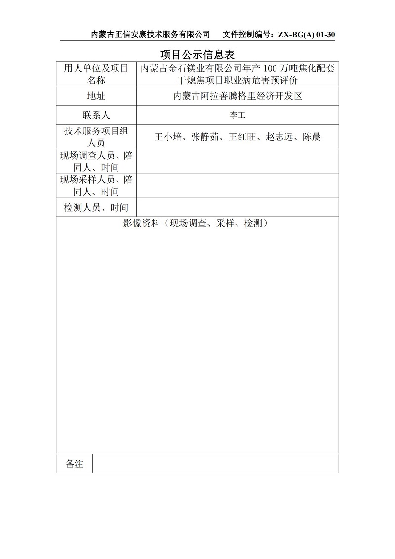 內蒙古金石鎂業有限公司年產100萬噸焦化配套干熄焦項目職業病危害預評價報告項目公示信息表