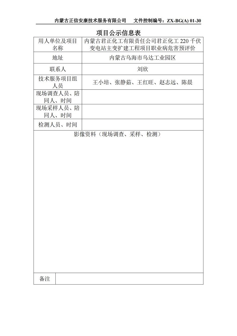 內蒙古君正化工有限責任公司君正化工220千伏變電站主變擴建工程項目職業病危害預評價項目公示信息表