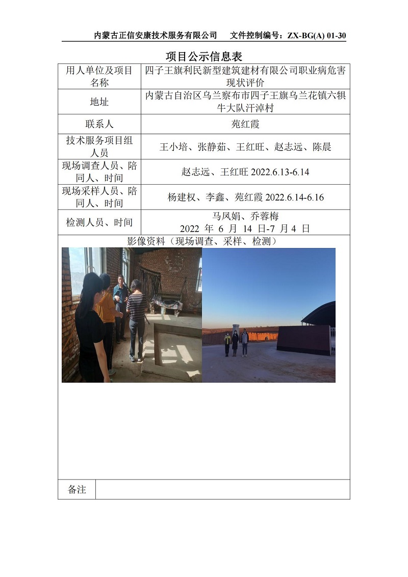 四子王旗利民新型建筑建材有限公司職業病危害現狀評價項目公示信息表