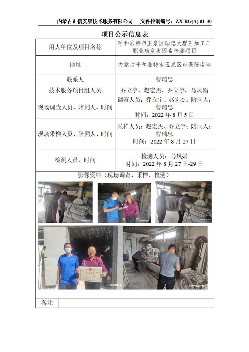 呼和浩特市玉泉區瑞忠大理石加工廠職業病危害因素檢測項目公示信息表