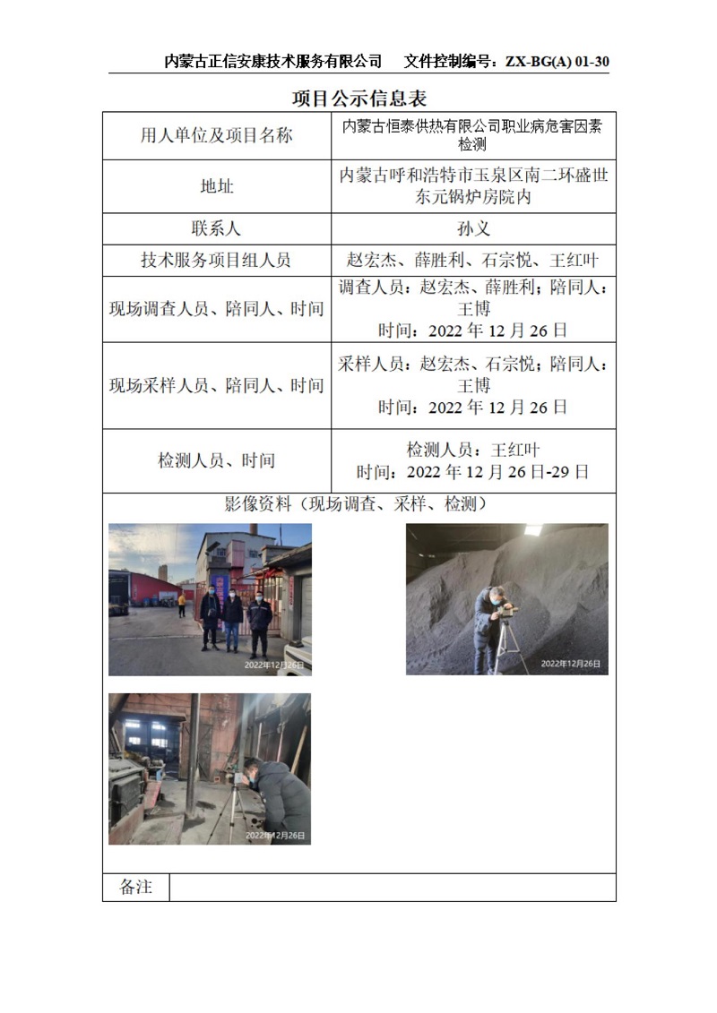 內蒙古恒泰供熱有限公司職業病危害因素檢測項目公示信息表_