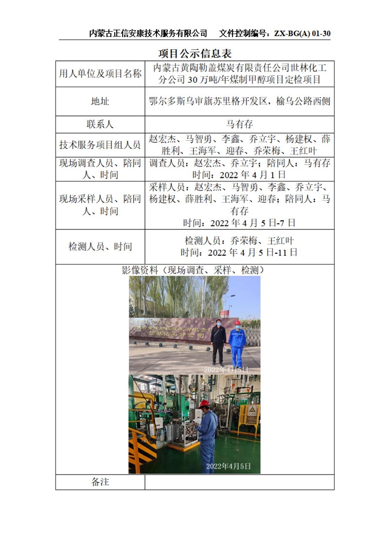 內(nèi)蒙古黃陶勒蓋煤炭有限責(zé)任公司世林化工分公司30萬噸年煤制甲醇項目定期檢測項目公示信息表