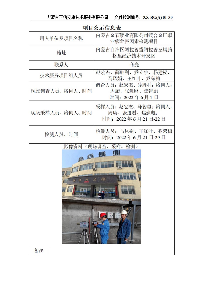 內(nèi)蒙古金石鎂業(yè)有限公司鎂合金廠職業(yè)病危害因素定期檢測項(xiàng)目公示信息表