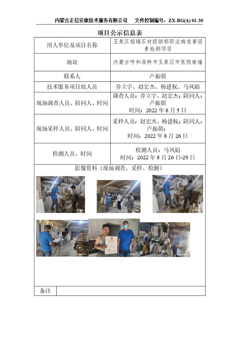 玉泉區銘瑞石材經銷部職業病危害因素檢測項目公示信息表