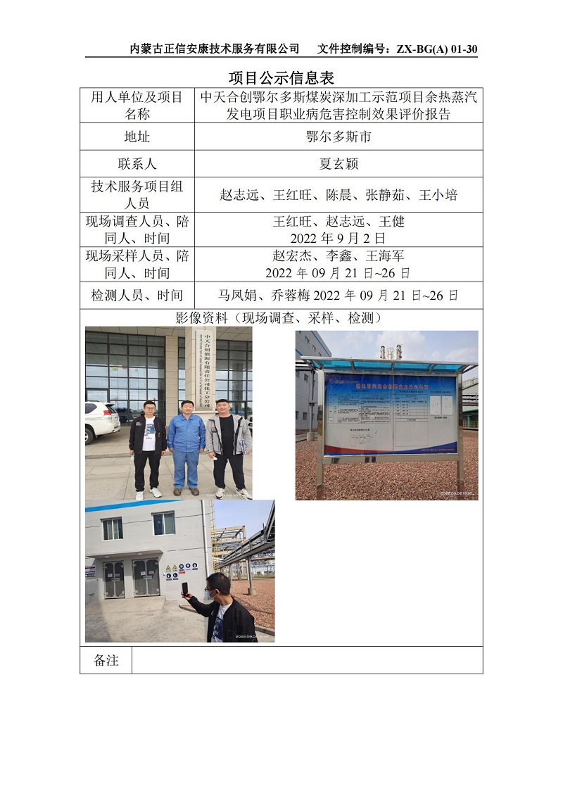 中天合創鄂爾多斯煤炭深加工示范項目余熱蒸汽發電項目職業病危害控制效果評價報告-公示信息表