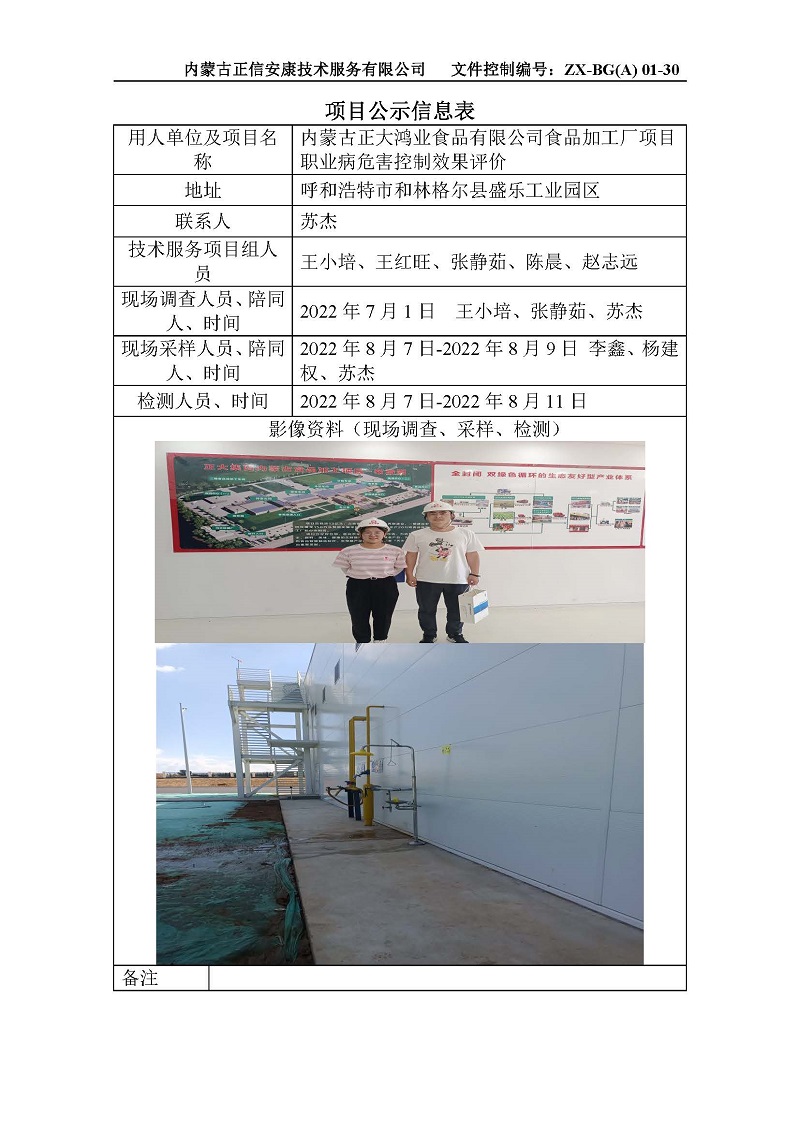 內蒙古正大鴻業食品有限公司食品加工廠項目職業病危害控制效果評價