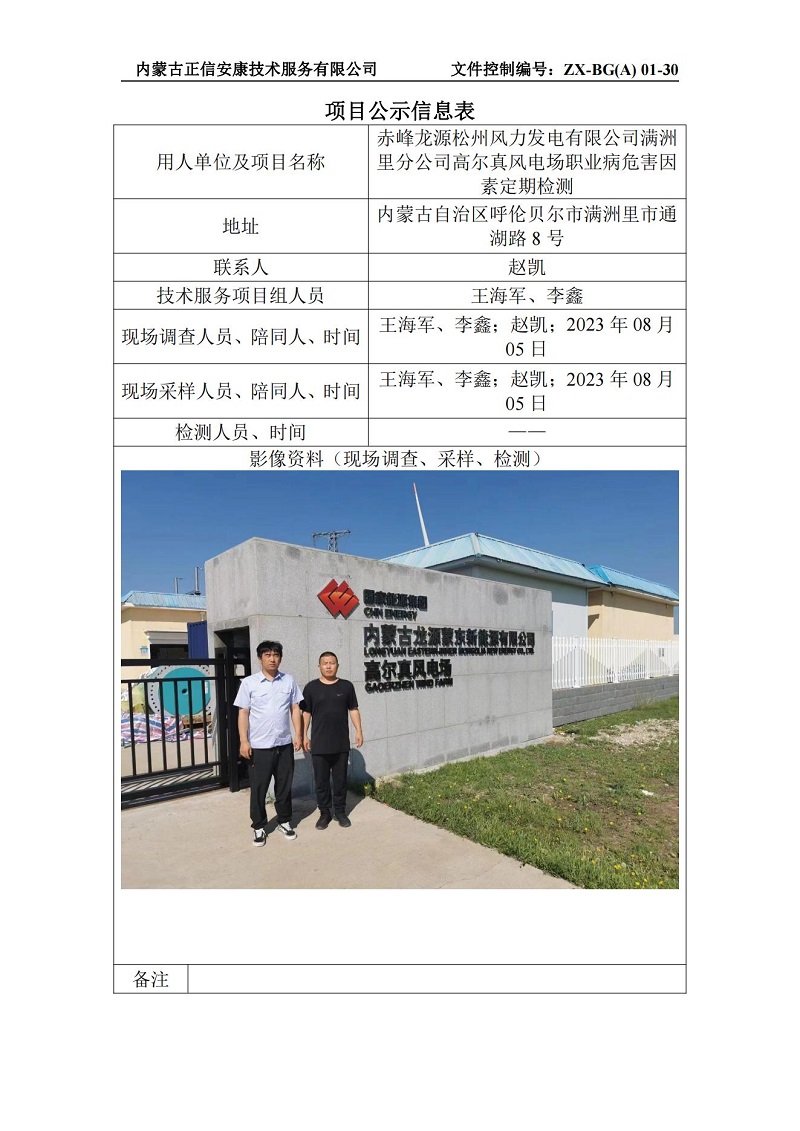 赤峰龍源松州風力發(fā)電有限公司滿洲里分公司高爾真風電場職業(yè)病危害因素定期檢測