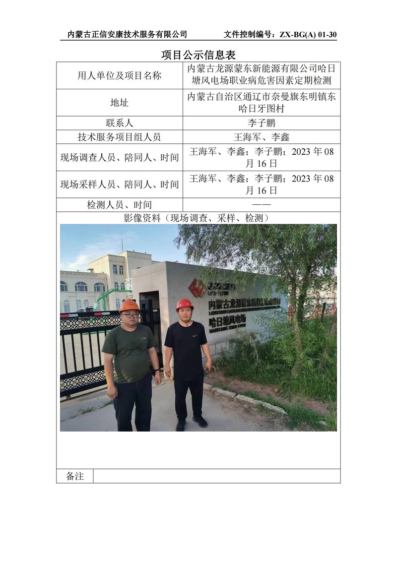 內蒙古龍源蒙東新能源有限公司哈日塘風電場職業病危害因素定期檢測