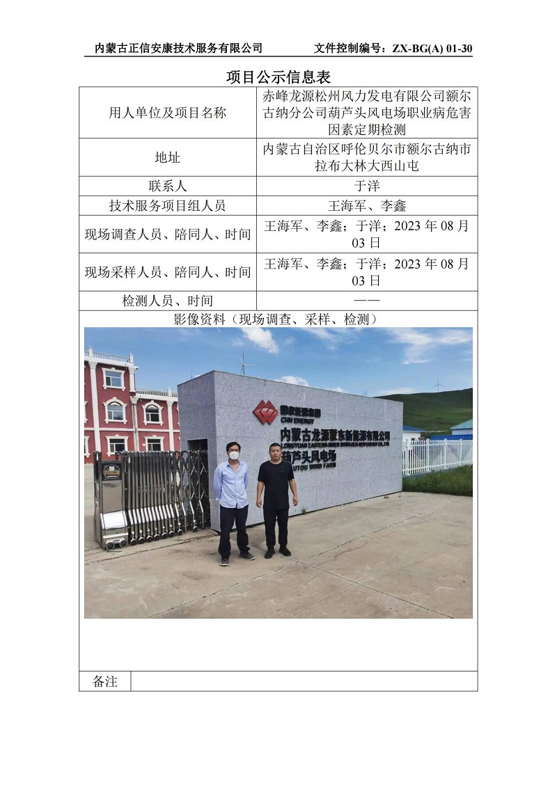 赤峰龍源松州風力發電有限公司額爾古納分公司葫蘆頭風電場職業病危害因素定期檢測