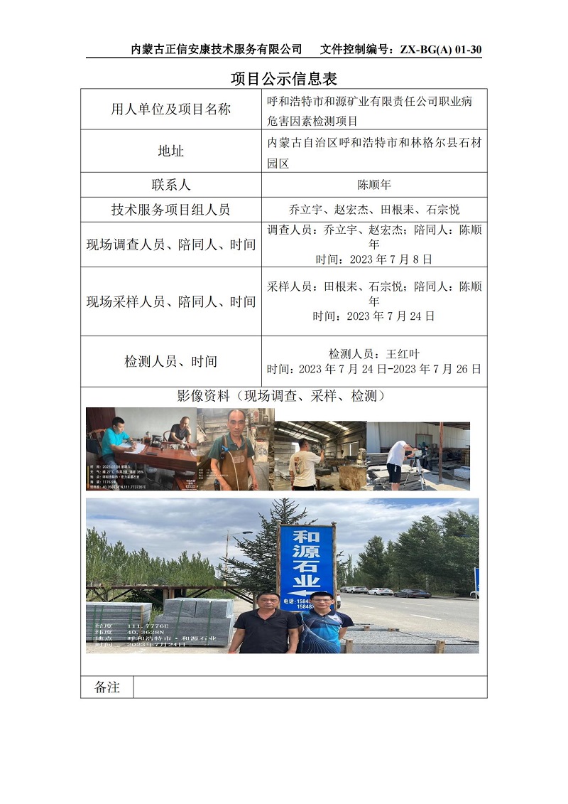 呼和浩特市和源礦業有限責任公司職業病危害因素檢測項目公示信息表