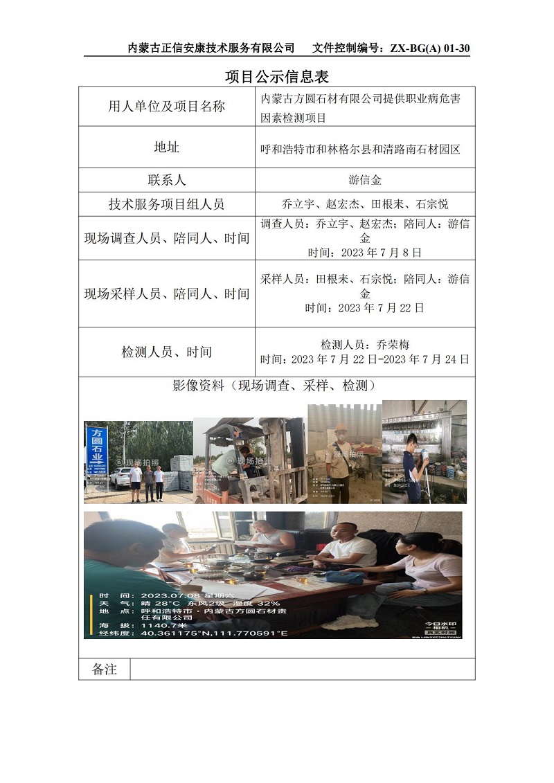 內(nèi)蒙古方圓石材有限公司職業(yè)病危害因素檢測(cè)項(xiàng)目公示信息表
