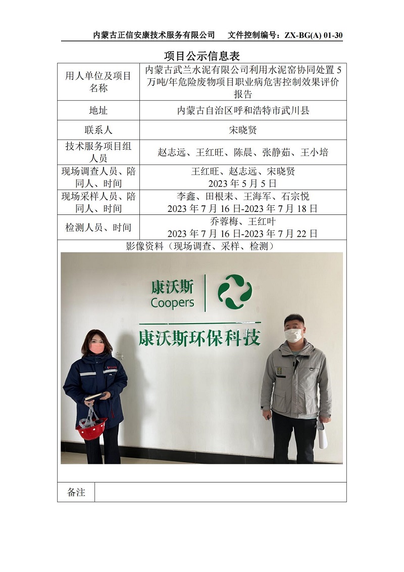 內(nèi)蒙古武蘭水泥有限公司利用水泥窯協(xié)同處置5萬噸年危險廢物項(xiàng)目職業(yè)病危害控制效果評價報告-項(xiàng)目公示信息表