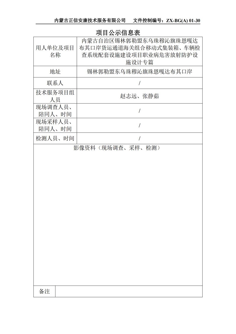 內蒙古自治區錫林郭勒盟東烏珠穆沁旗珠恩嘎達布其口岸貨運通道海關組合移動式集裝箱、車輛檢查系統配套設施建設項目職業病危害放射防護預評價報告-項目公示信息表