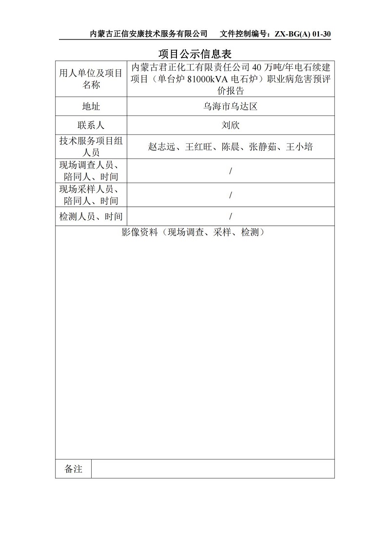 內蒙古君正化工有限責任公司40萬噸年電石續建項目(單臺爐81000kVA電石爐)職業病危害預評價報告-項目公示信息表
