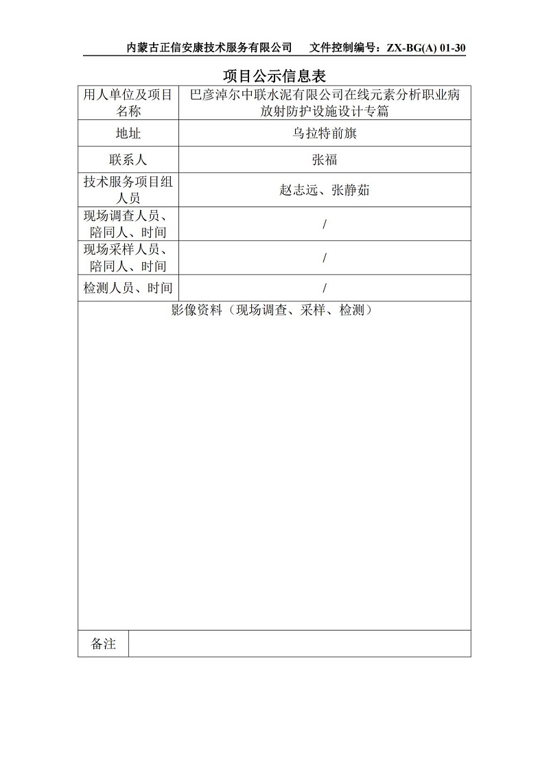 巴彥淖爾中聯(lián)水泥有限公司在線元素分析職業(yè)病放射防護設施設計專篇-項目公示信息表