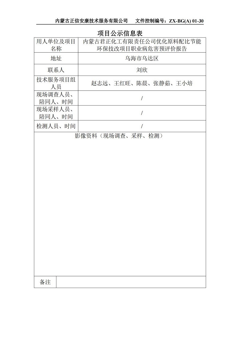 內蒙古君正化工有限責任公司配套原料碳化鈣產能置換技術升級改造項目職業病危害預評價報告-項目公示信息表_00