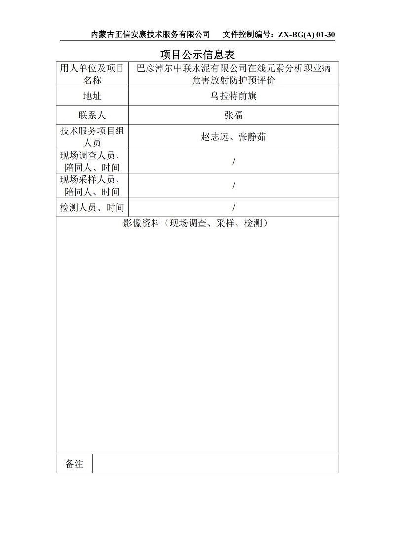 巴彥淖爾中聯水泥有限公司在線元素分析職業病危害放射防護預評價-項目公示信息表
